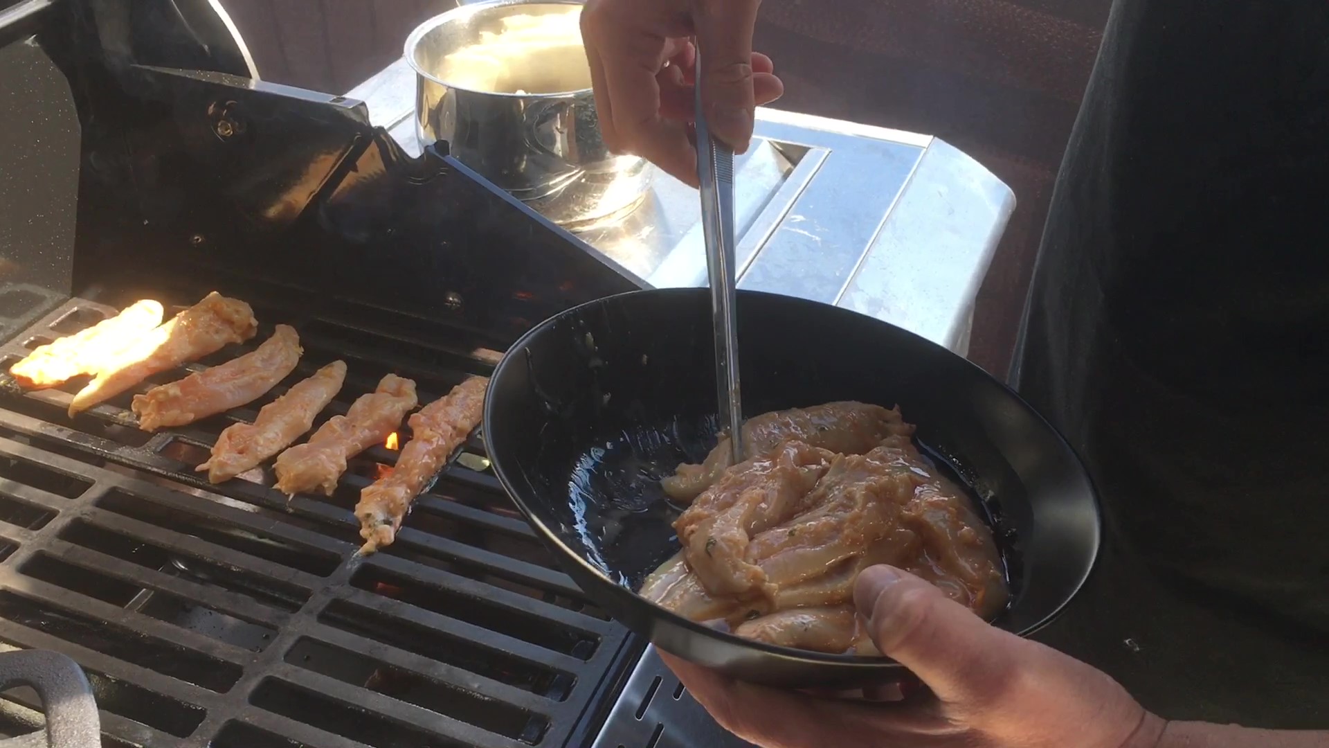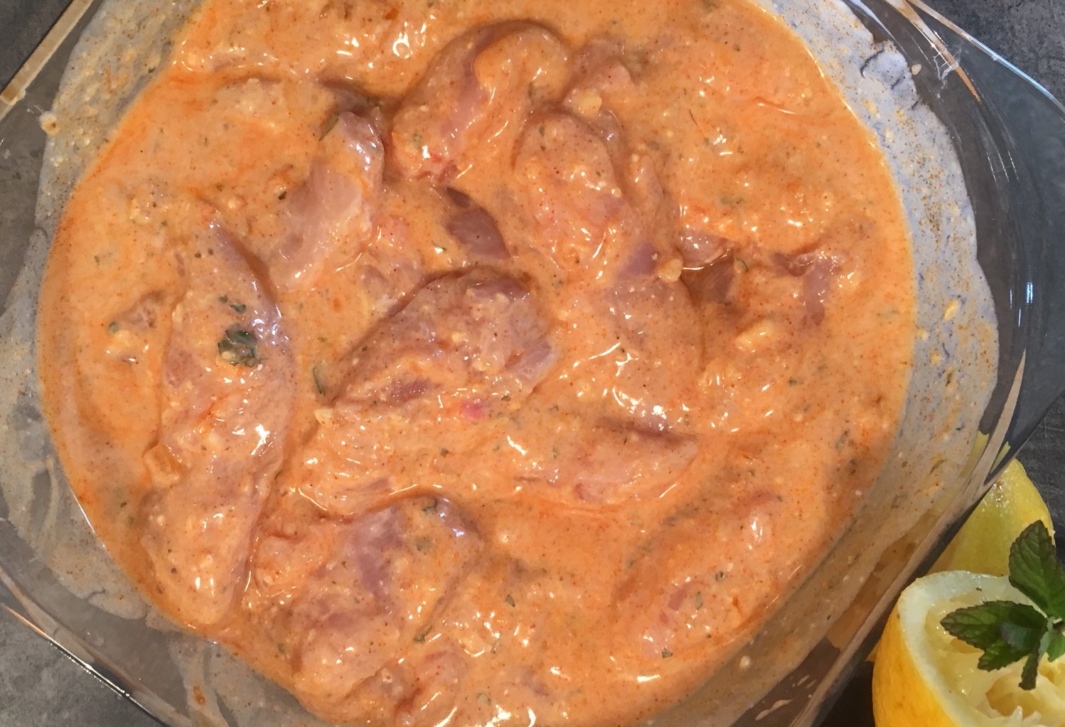 - Marinering: Dagen før retten skal tilberedes på grillen, starter man med at marinere kyllingebrysterne. Kyllingebrysterne skæres i tommelfingertykke strimler, lægges i en frysepose med følgende ingredienser: finthakket hvidløg, finthakket frisk ingefær, grofthakkede friske mynteblade, Tikka Marsala pasta, citronsaft, yoghurt naturel, salt og paprika.