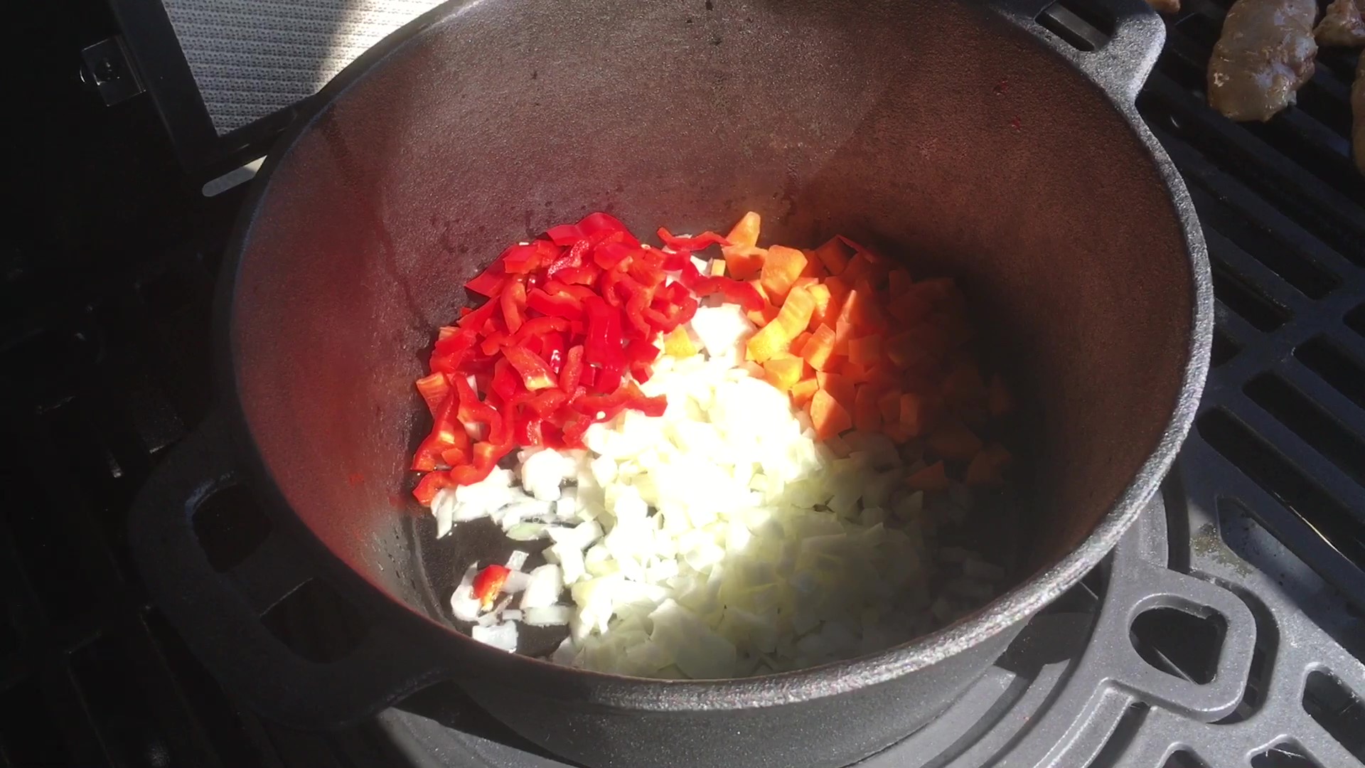 Den har en searing side-brænder, man bruger til at brune kødet af på og til at stege steak på. Derudover har den 5 brændere, 4 til almindelig stegning og en med dobbelt varme til bøffer og alt andet, der skal steges hårdt. Så er der et ekstra gasblus i højre sidebord, hvor man kan lave saucer og koge kartofler på. Bagerst findes en bagbrænder, der bliver ekstremt varm og bruges, når man steger kyllinger eller porchetta, hvor man ønsker en sprød svær, og sidst men ikke mindst, har den ProTouch System med ringe i støbejernsristen, som man kan tage op og stille gryder i, så nu kan man også lave gryderetter på grillen, og det er netop det, vi skal idag. Vi skal lave en gryderet - En indisk Chicken Tikka Marsala.