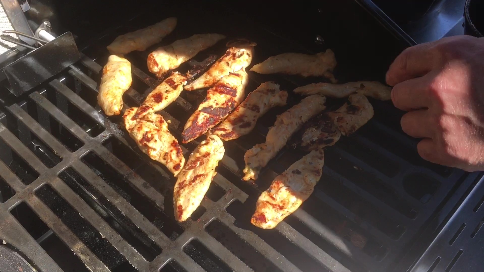 Tag kyllingebrysterne op af marinaden ved at holde posen fast om brysterne og således skrabe så meget af marinaden af som muligt, men gem marinaden. Hæld lidt olie over kyllingebrysterne og grill dem på begge sider på grillristen. Læg kyllingestykkerne over den varmeste brænder på grillen, Power-brænderen i højre side. (Ikke Searing Side-brænderen, da den er for varm til et sart kyllingebryst)