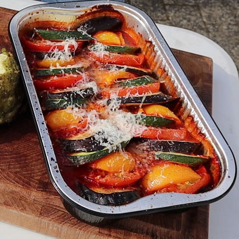 Læg de bagte Portobello-strimler på grillen ved siden af de andre grøntsager og grill ved medium-høj varme.
