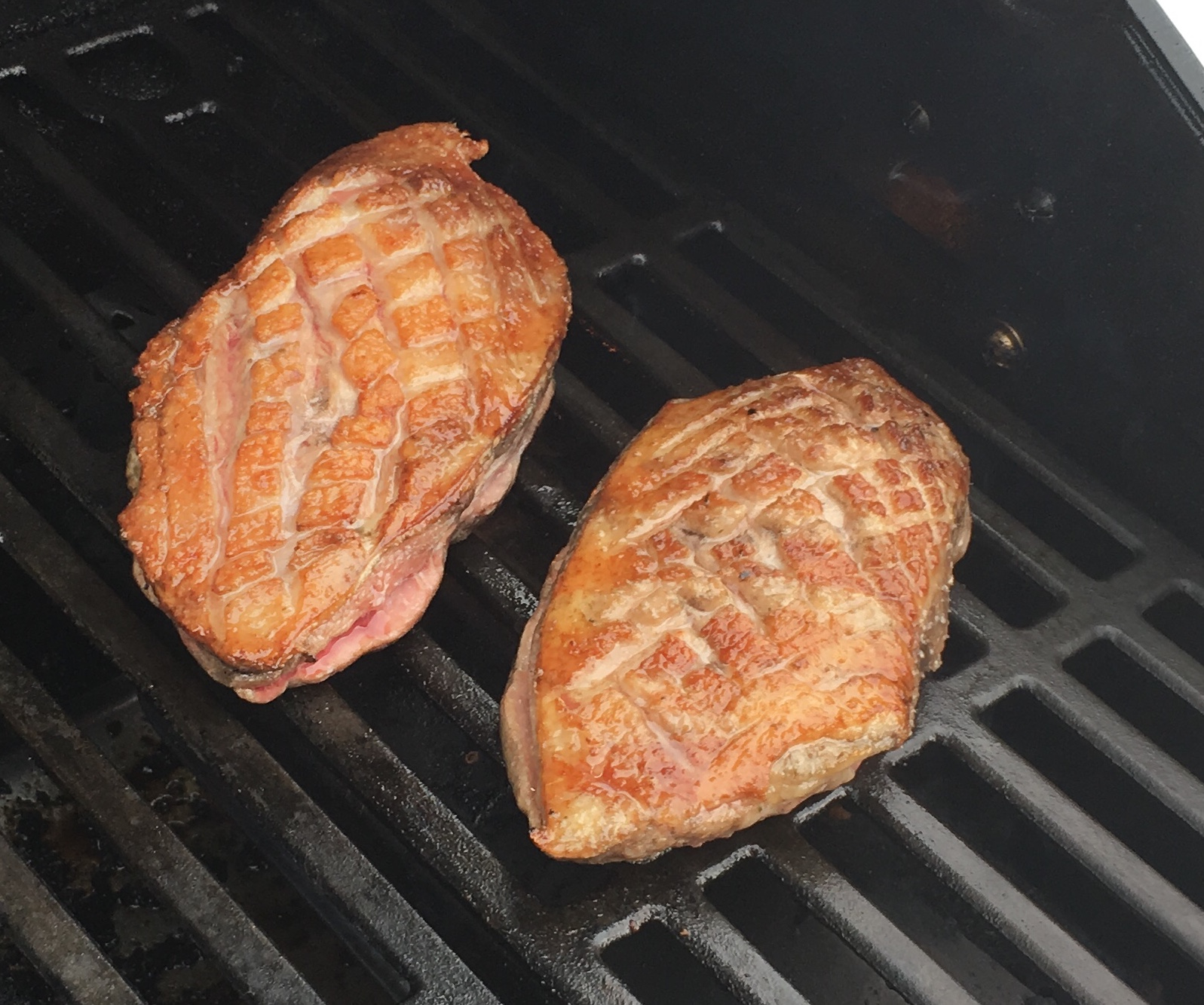 Først brunes andebrysterne godt af, så de er flot gyldne på begge sider. De to yderste brændere til højre (her bruges en 5B Deluxe) skrues helt op, og her lægges andebrysterne. Først grilles de med skindsiden nedad i 6-8 min.