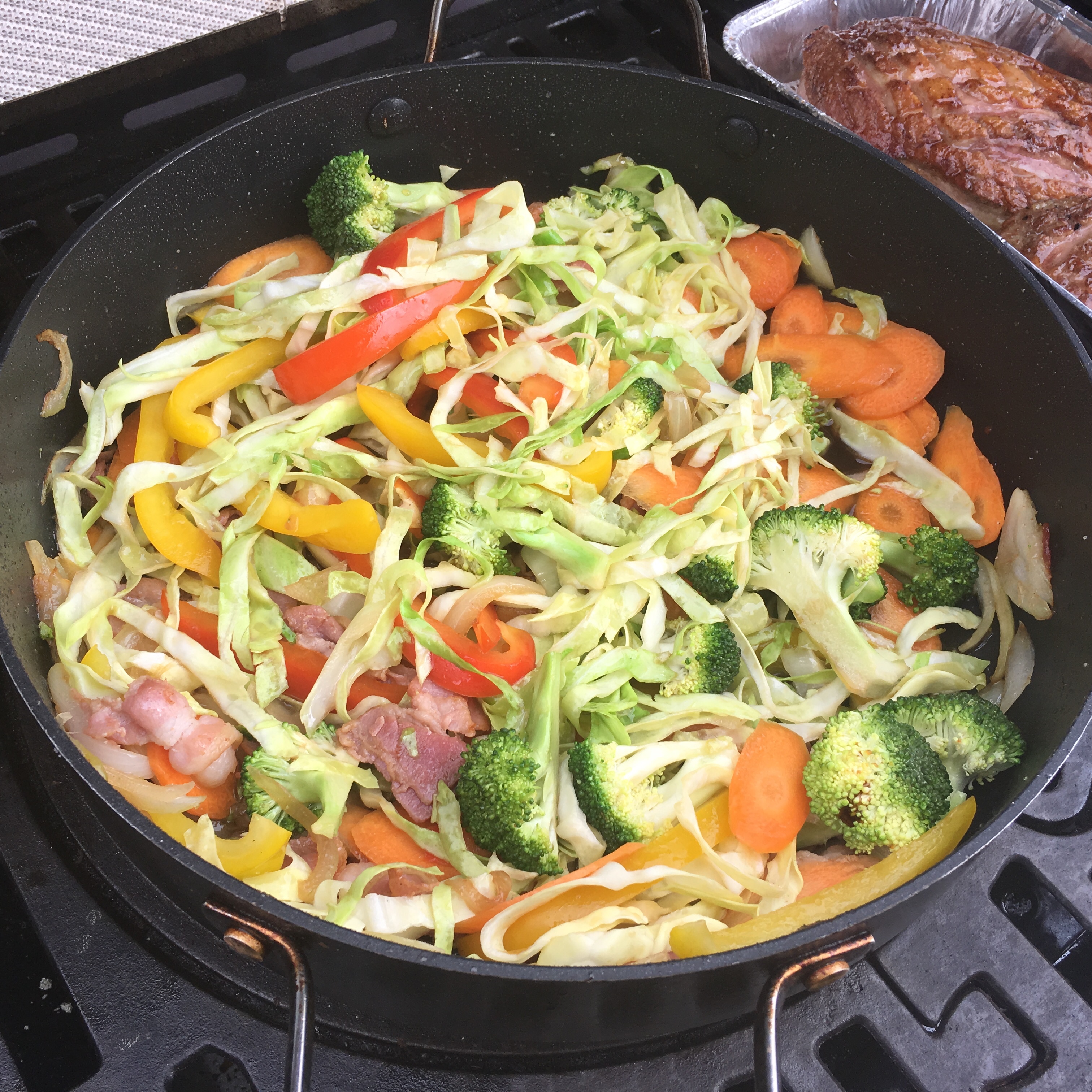 Mens andebrysterne brunes af, påbegyndes stegningen af asiatisk inspireret grøntager. Hertil bruges en gryde eller sautépande i grillen. Først brunes bacon af, løg kommes på og man lader det hele stege lidt sammen. Løgene skal ikke blive brune, de skal blot stege med og give smag. Så tilsættes gulerødder, broccoli, rød og gul peber samt spidskål. Alt steges sammen, til det er mørt, og der må meget gerne være bid i grøntsagerne.
