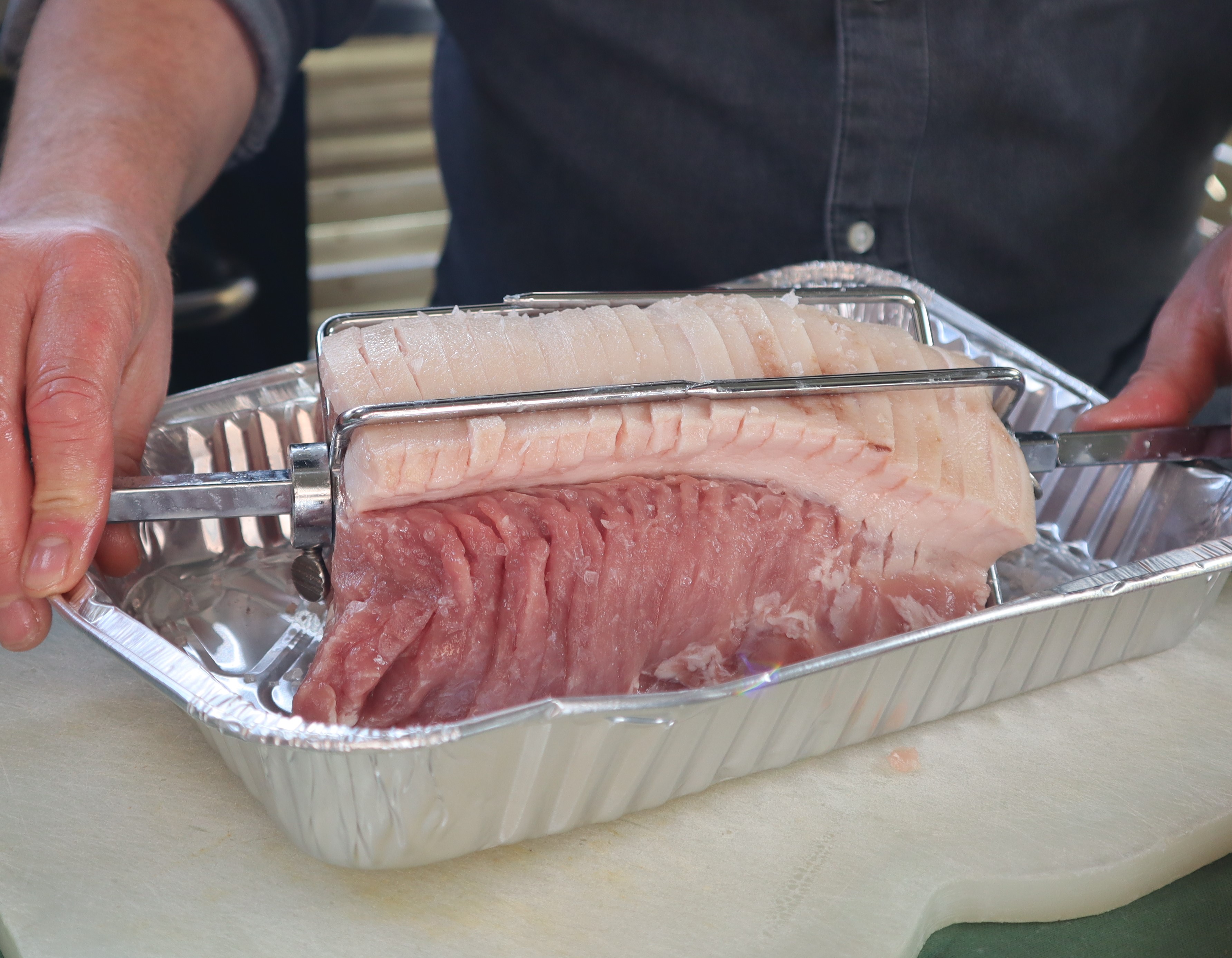 Kamsteg: Tjek at sværene på stegen er ridset helt ned gennem fedtet, men ikke ned i kødet. Gnid stegen ind i salt, - saltet skal godt ned mellem sværene.