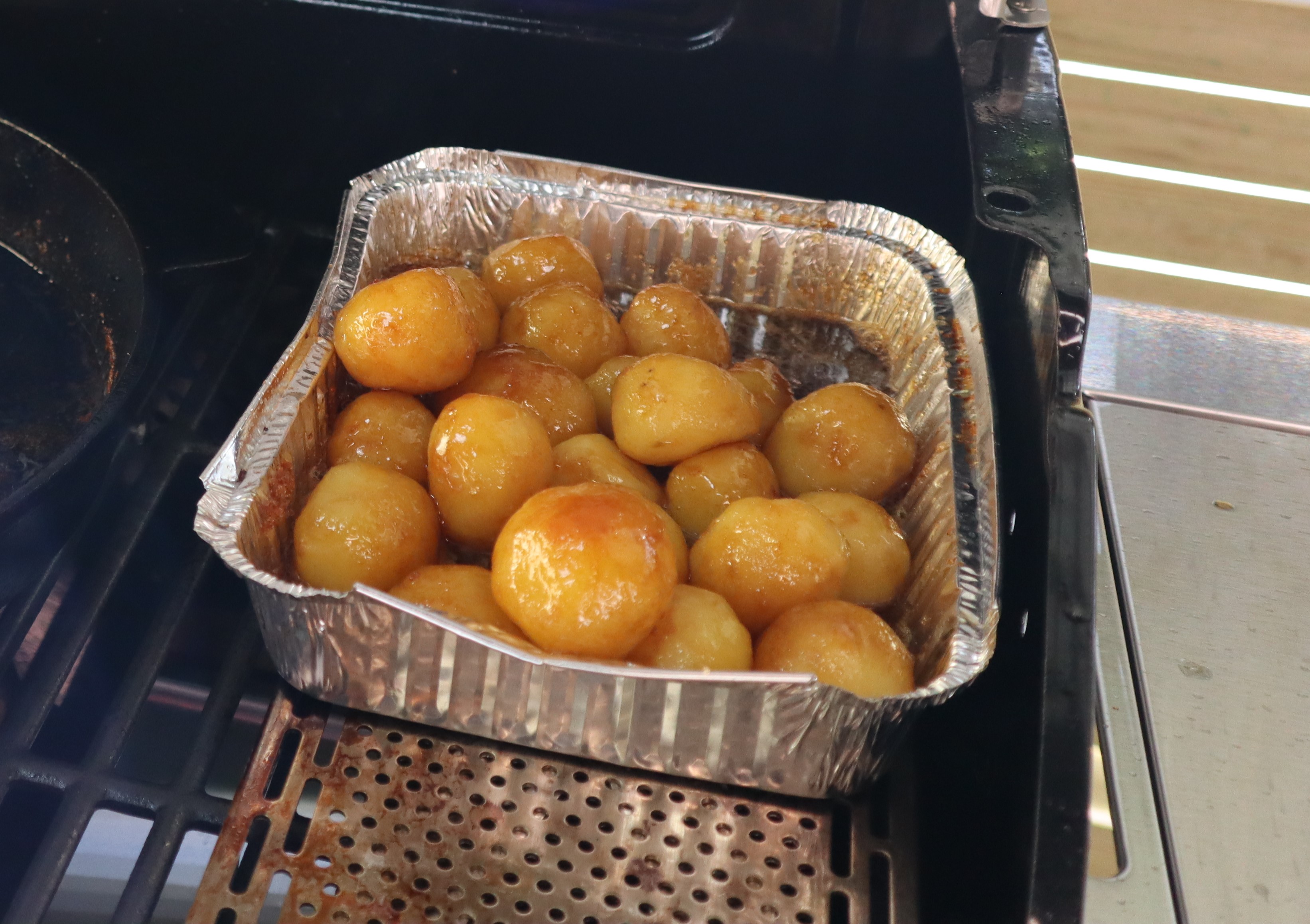 BRUNEDE KARTOFLER: stil bakken i grillen og luk låget. Vend derefter kartoflerne rundt, ca. hvert 10 minut, og lad kartoflerne stege i sukkerblandingen, indtil de er flot gyldne.