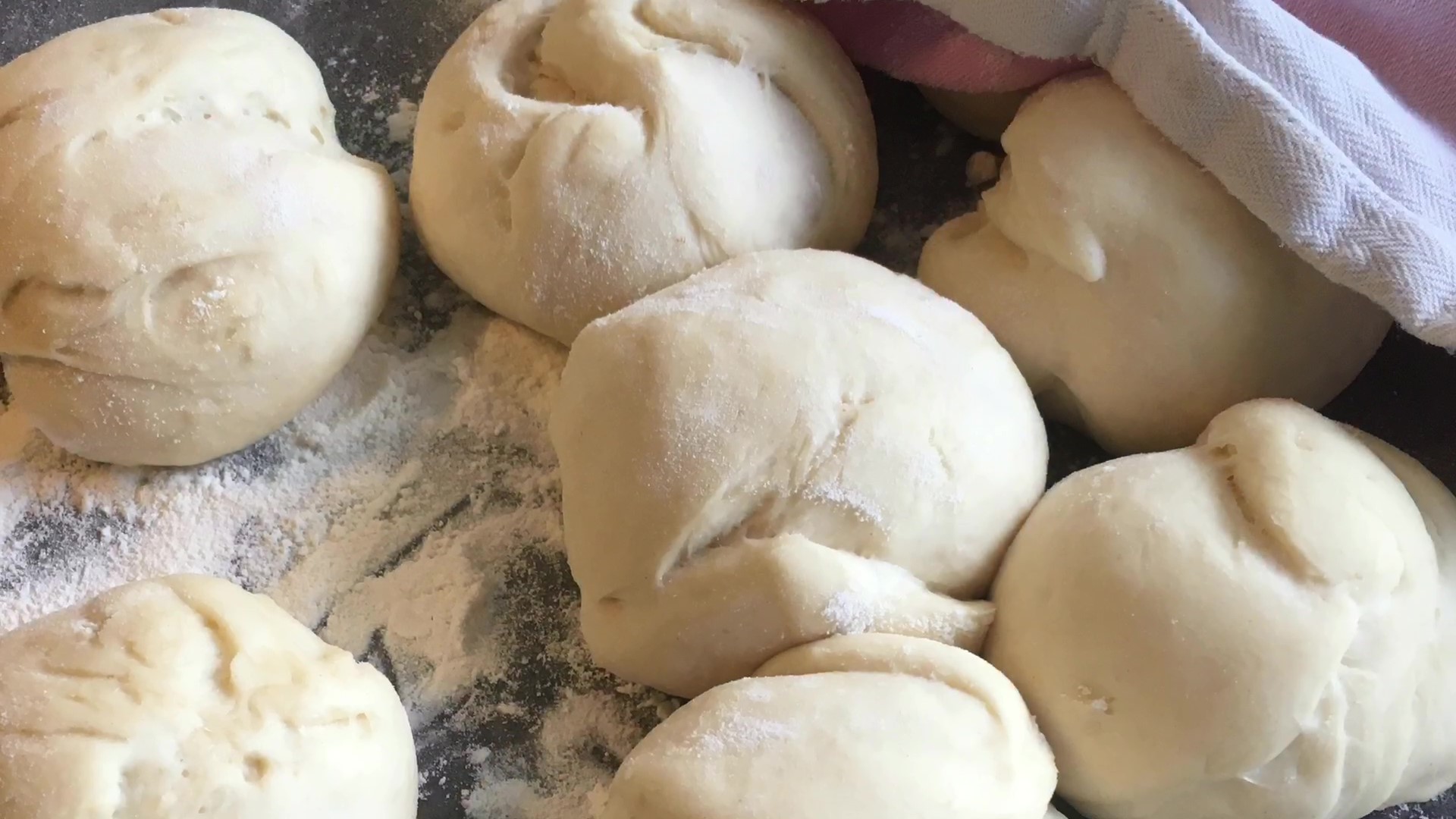 - Derefter hældes dejen ud, og den deles i lige store stykker, æltes let og formes til kugler.
