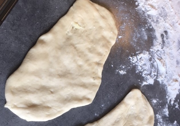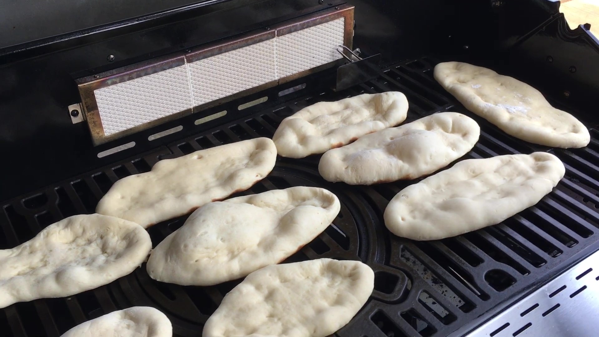 Når grillen er varm, formes bollerne til aflange brød og bages gyldne på grillen. Det tager ca. 3-4 minutter at bage dem gyldne på hver side