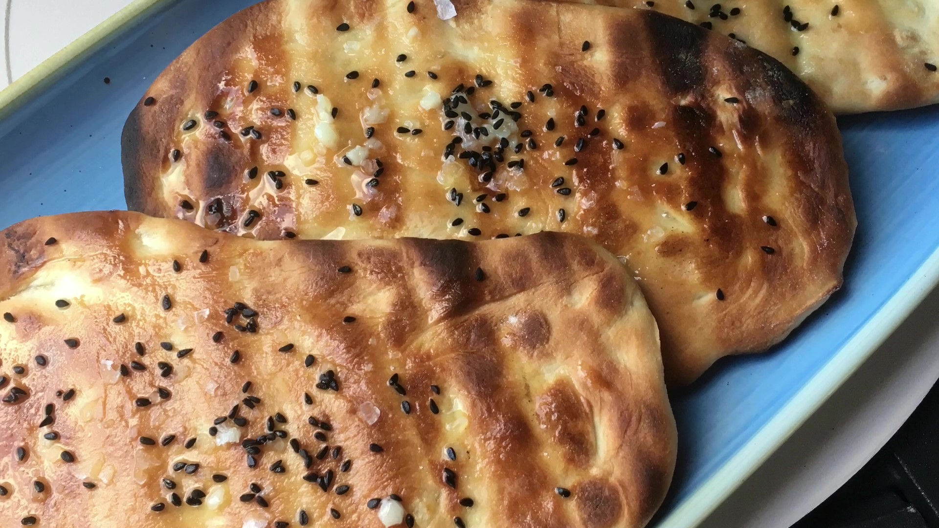 Naanbrødene pensles med smør, drysses med topping efter eget valg og spises brandvarme. God appetit!