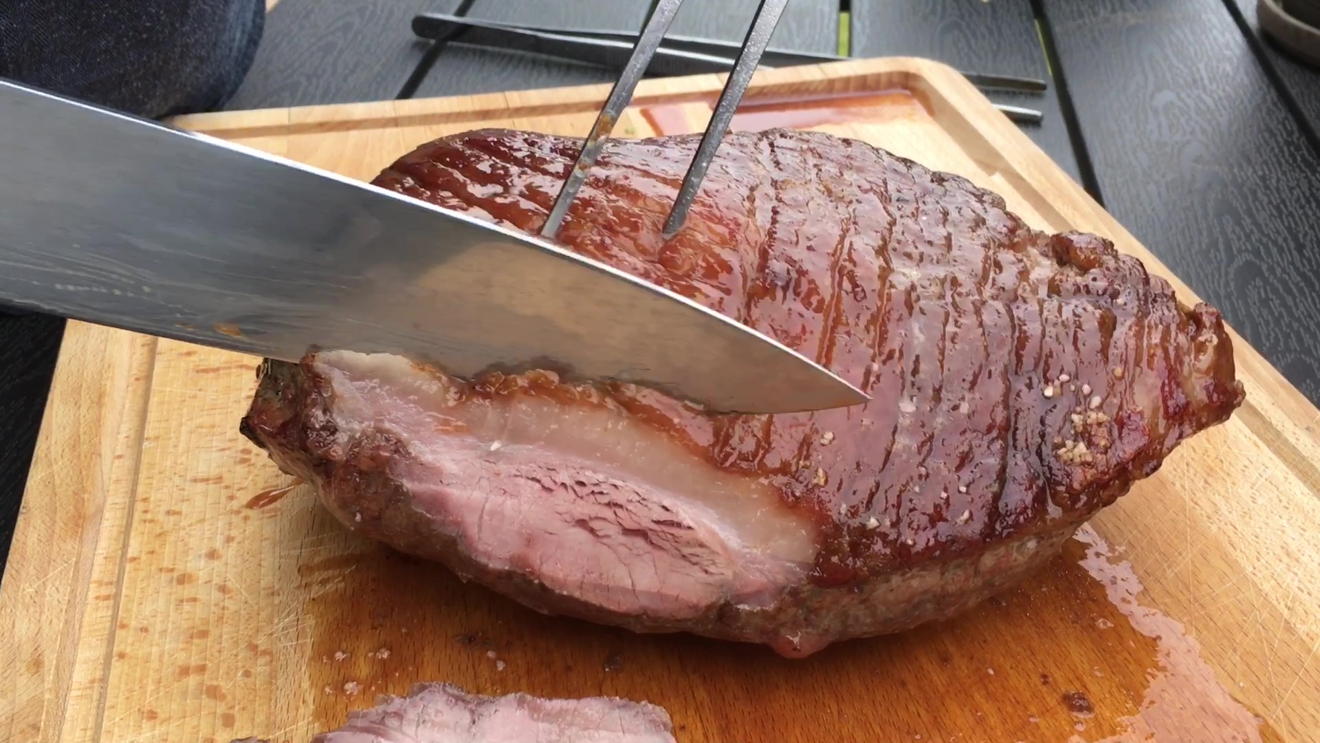 Når culottestegen har opnået en kernetemperatur på 55 grader, tages den af og hviler i 10 min., så bliver kødet fint rosa indvendig.