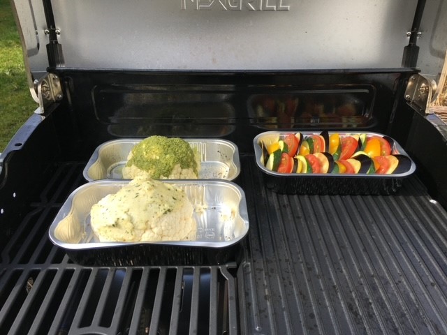 Foliebakken med ratatouillen stilles i grillen, låget lukkes og grøntsagerne bages til de er halvvejs møre.
