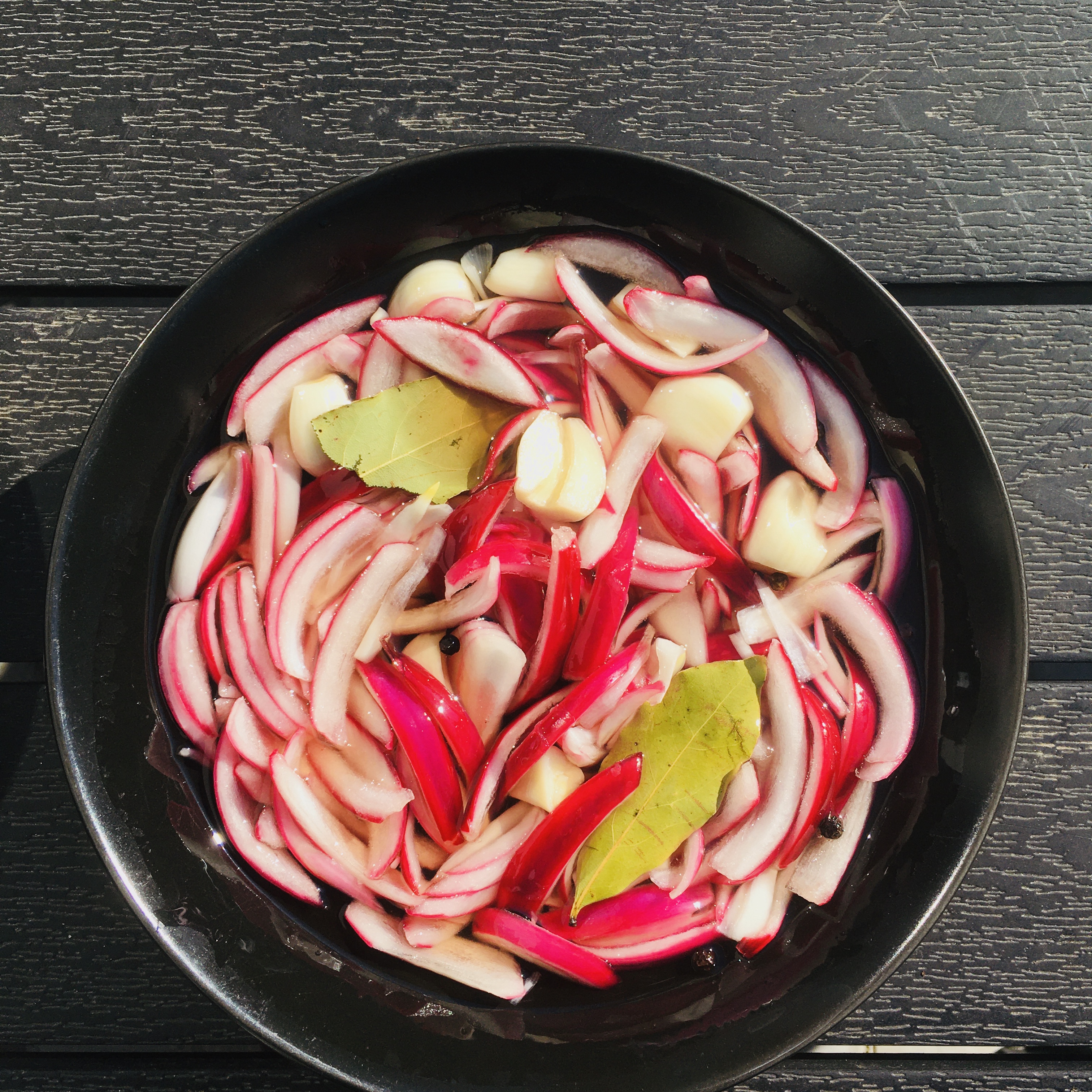 Syltede rødløg: Skræl rødløgene og skær dem i tynde både, pil hvidløgene, halver dem og læg dem ned til rødløgene sammen med lidt laurbærblade. Hæld den kogende lage over og lad det køle af. Rødløgene opbevares i køleskabet.