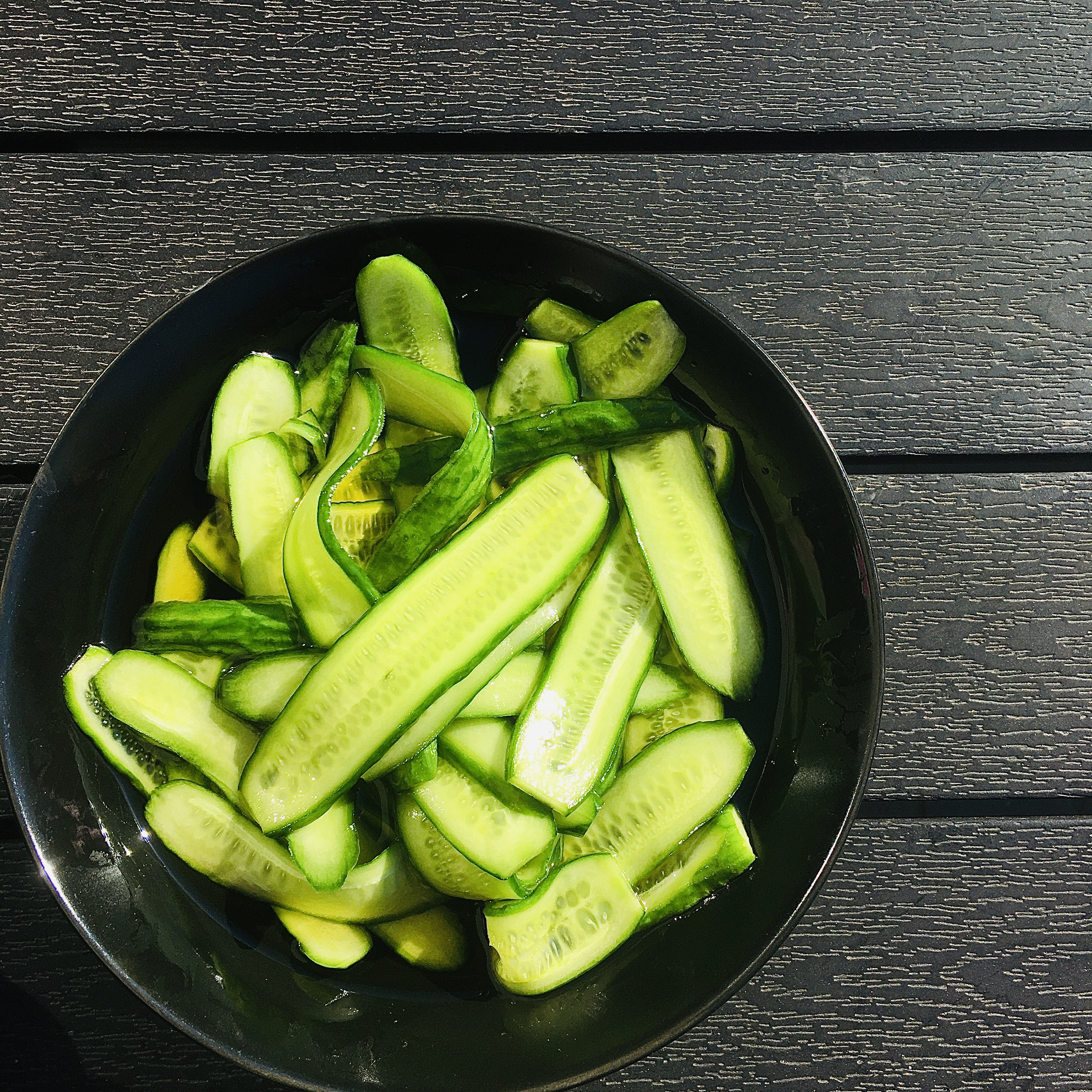 Agurkesalat: Skoleagurker vaskes og skæres i tynde strimler på langs. Agurkestrimlerne lægges i en stor skål og drysses med lidt salt. Efter en times saltning skylles agurkestrimlerne og overhældes med den kolde syltelage.